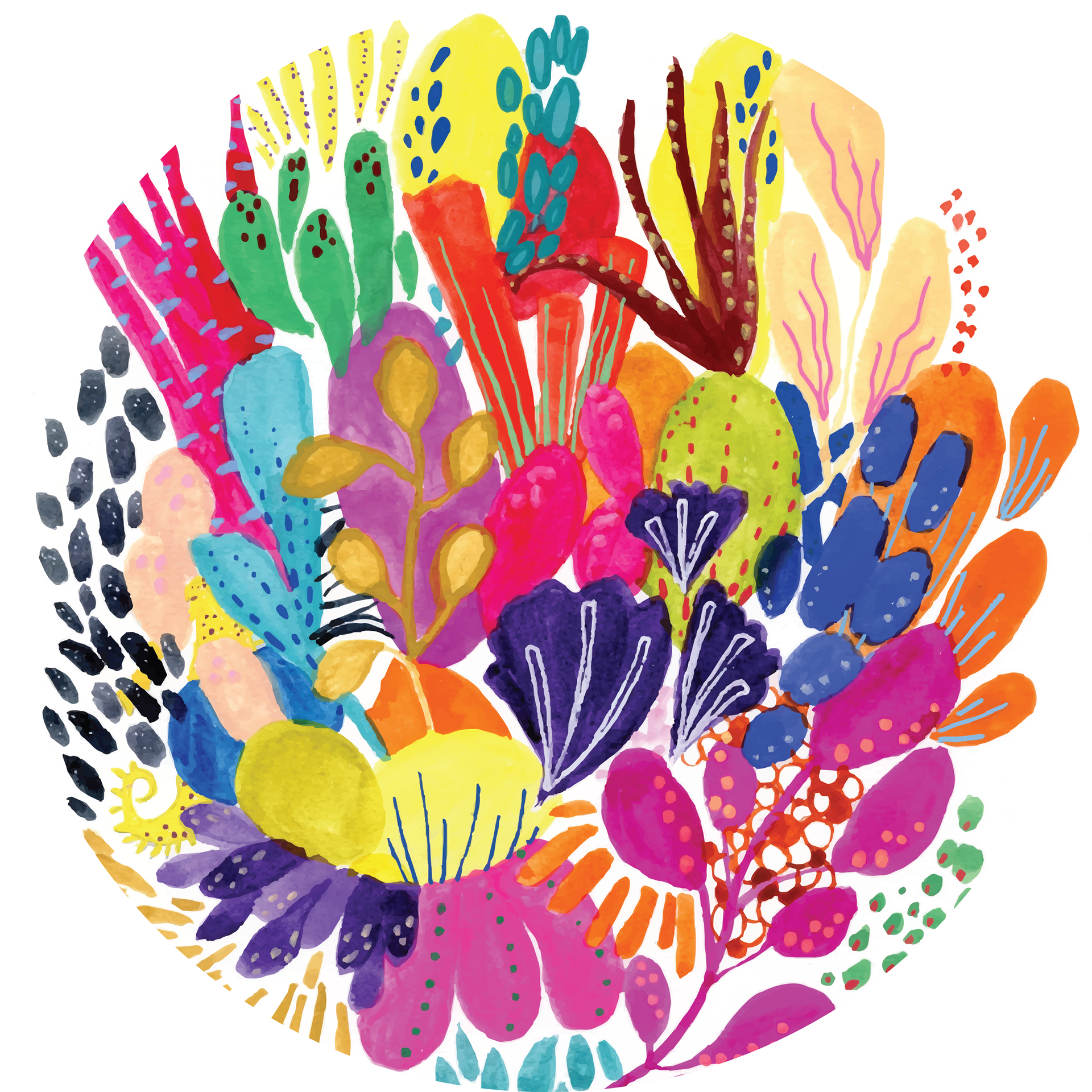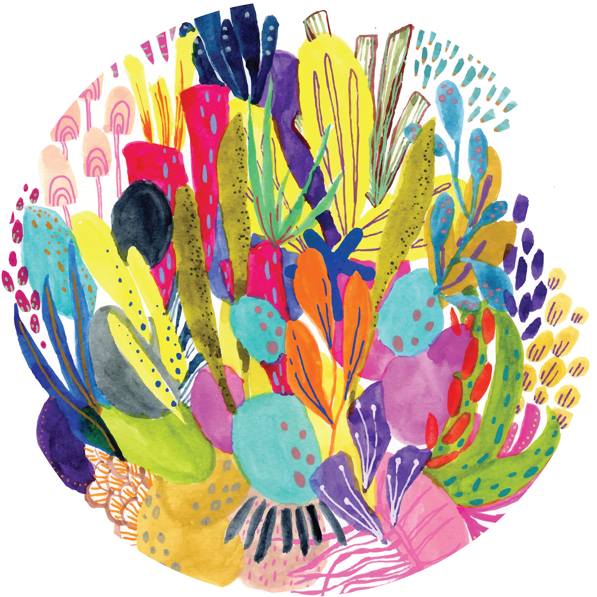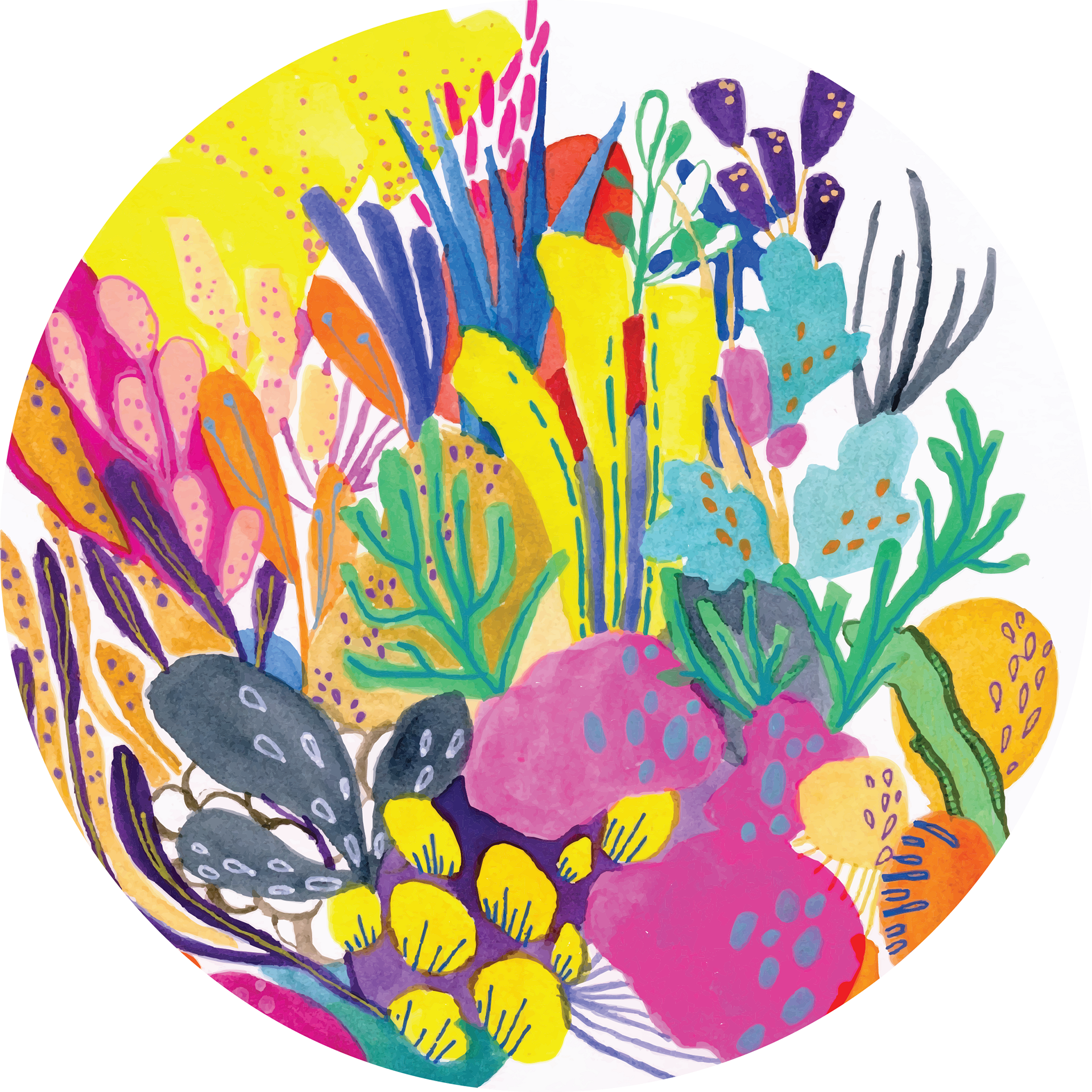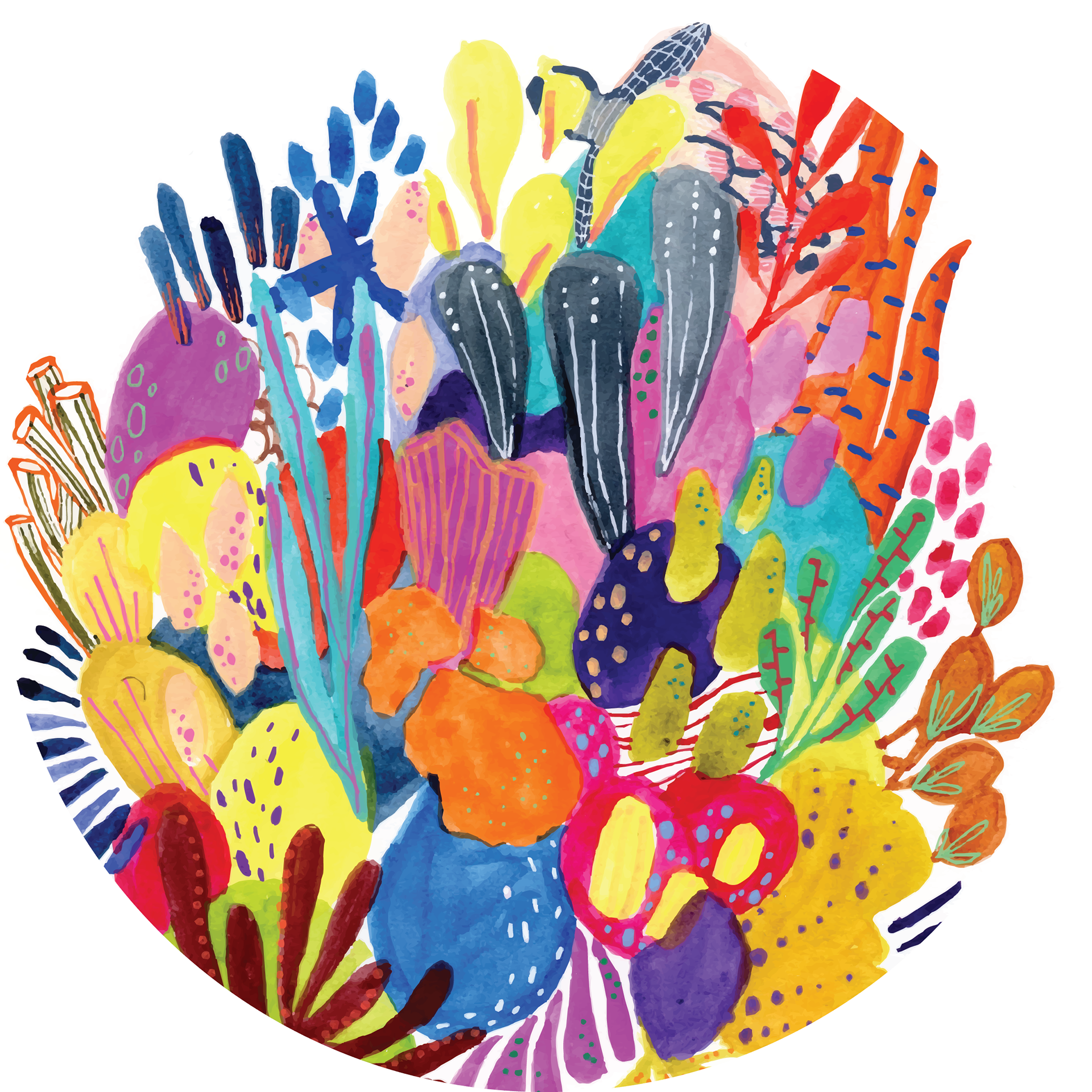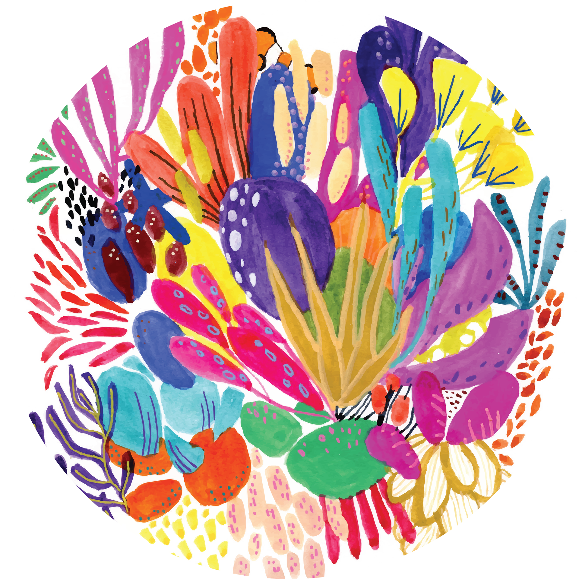 This mural is made up of 5 watercolour, gouache and acrylic artworks which were then printed onto vinyl and installed on circular windows (3 feet each in diameter) at South London Community Pool. This artwork was commissioned by the London Arts Council and the City of London as a part of the Songlines Project. More information can be found here